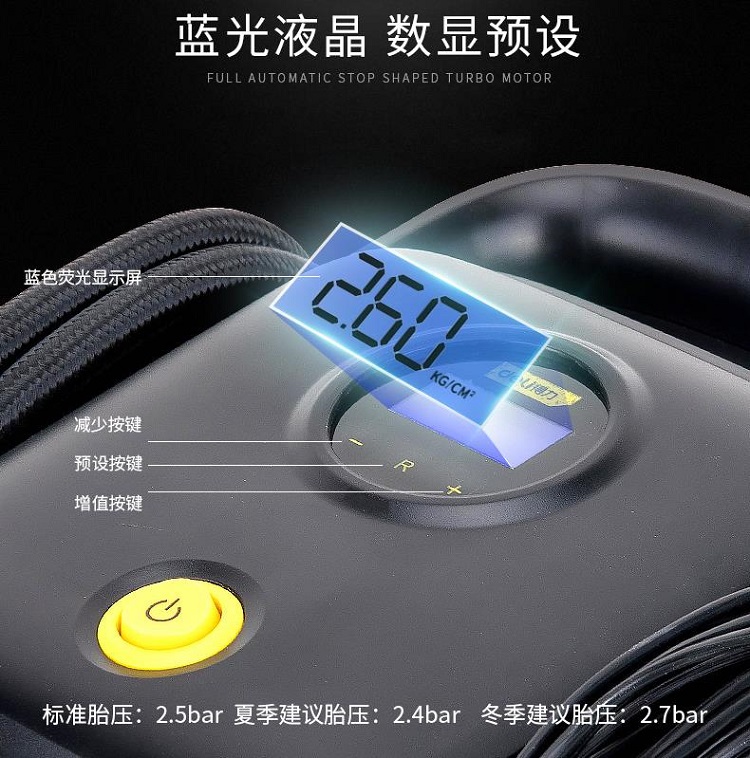 便攜式打氣筒藍光顯示屏,具有數(shù)顯預(yù)設(shè)功能