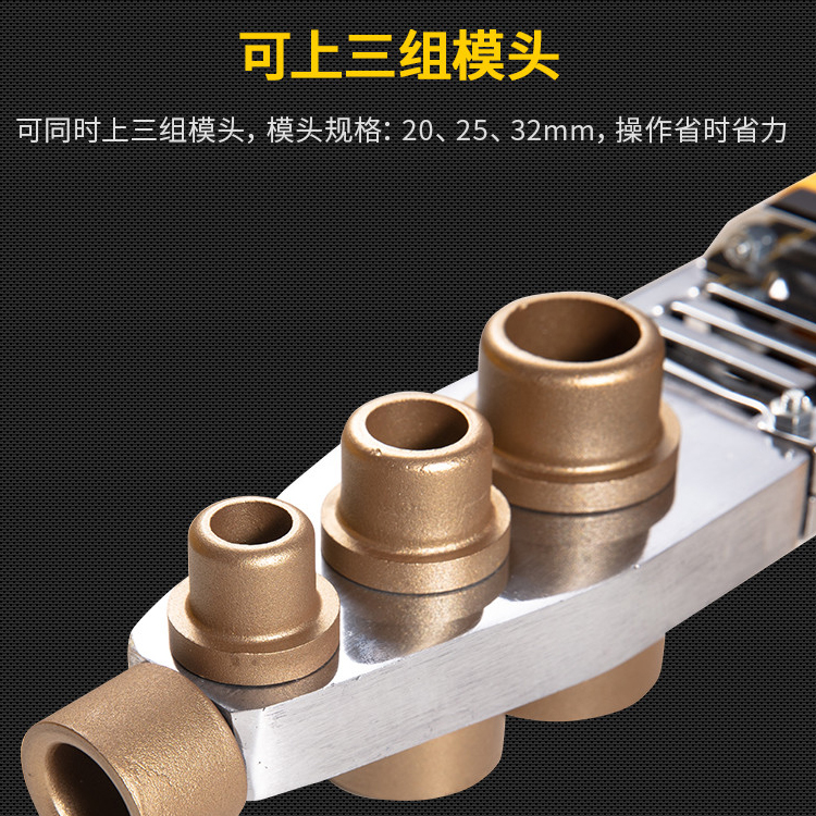 熱熔器可同時(shí)上三組模頭,模頭規(guī)格: 20、25、32mm,操作省時(shí)省力