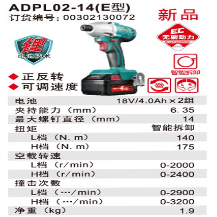 DCA充電式?jīng)_擊起子機(jī)ADPL02-14(E型)結(jié)構(gòu)新穎、體積小、重量輕、安全可靠。