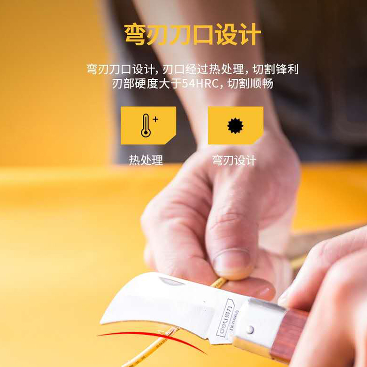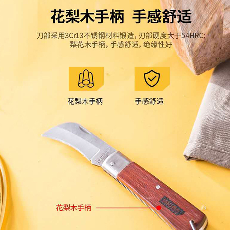 電工刀花梨木手柄手感舒適,刃部硬度大于54HRC;