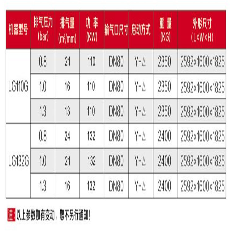 紅五環(huán)LG系列大型固定式螺桿空氣壓縮機(jī),參數(shù)表