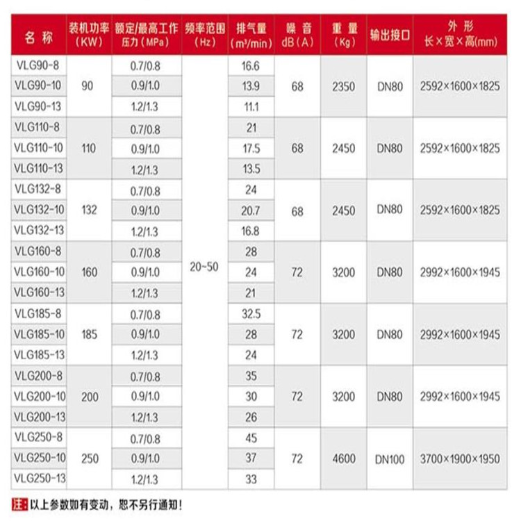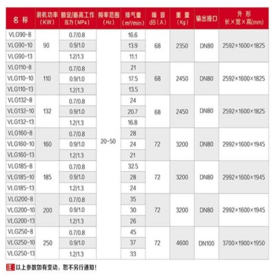 紅五環(huán)VLG系列變頻節(jié)能螺桿空氣壓縮機,參數(shù)表