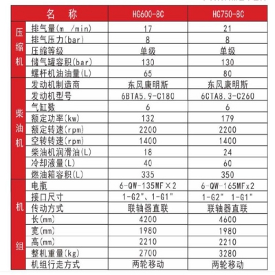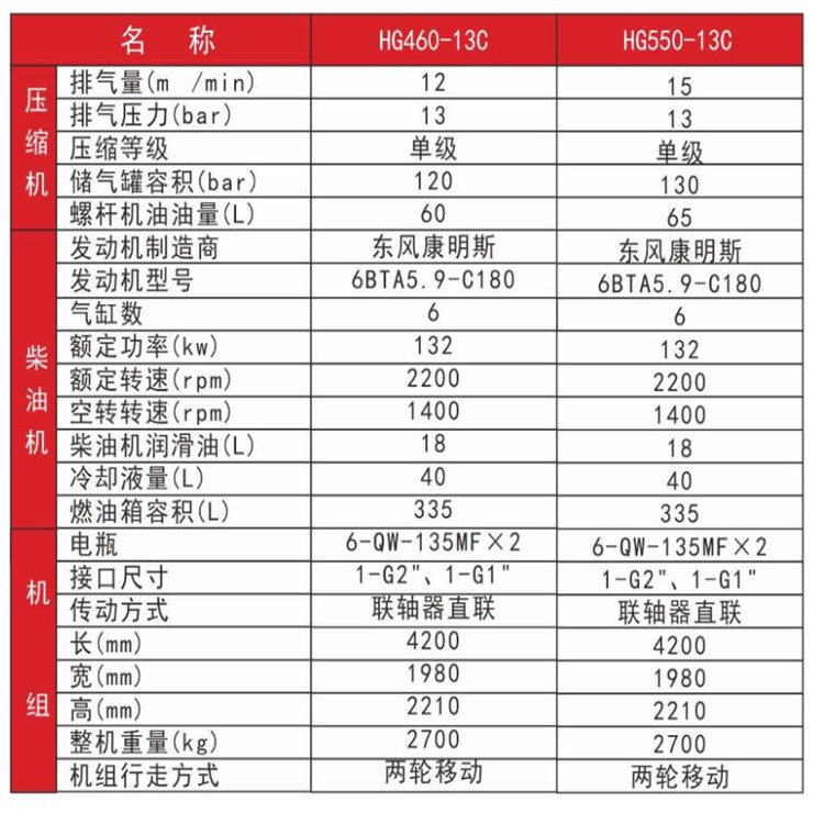 紅五環(huán)柴驅(qū)-HG系列中低壓移動(dòng)空壓機(jī),HG460、HG550參數(shù)表