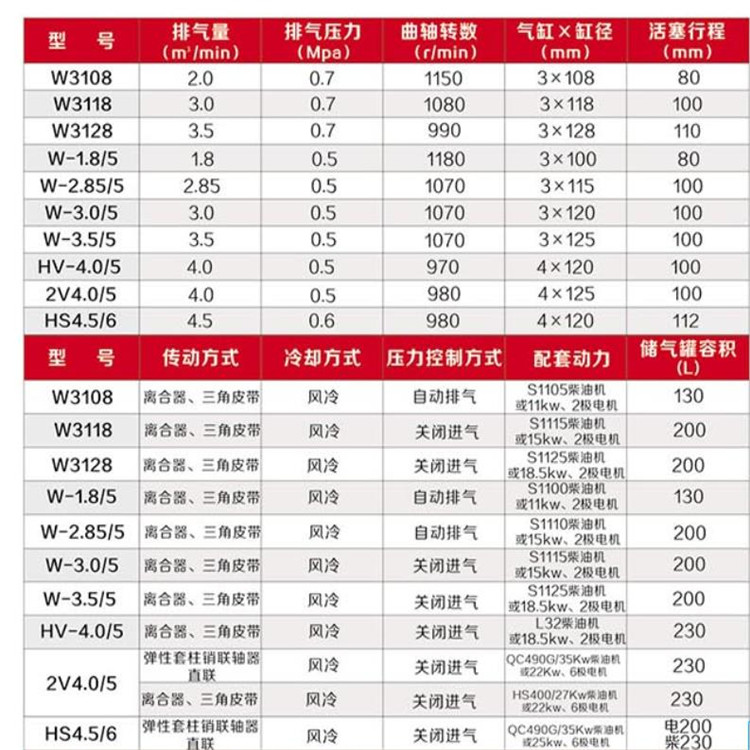 紅五環(huán)礦山用活塞式空壓機(jī)系列,參數(shù)表