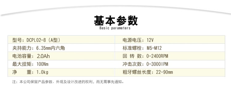 東成充電式沖擊起子機DCPL02-8E型基本參數