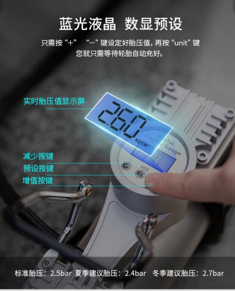 便攜式充氣泵采用藍光液晶,數(shù)顯預(yù)設(shè)