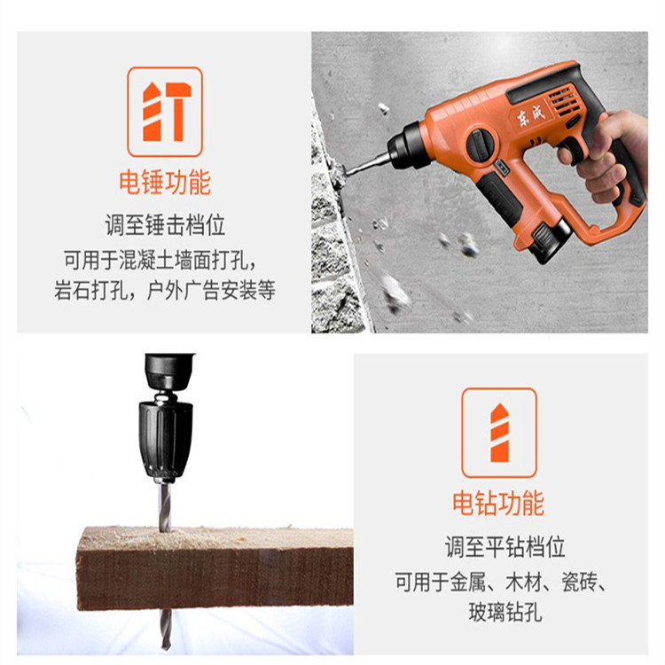 電錘產(chǎn)品特點:有效散熱、無線動力、碳鋼鉆夾頭、無極變速