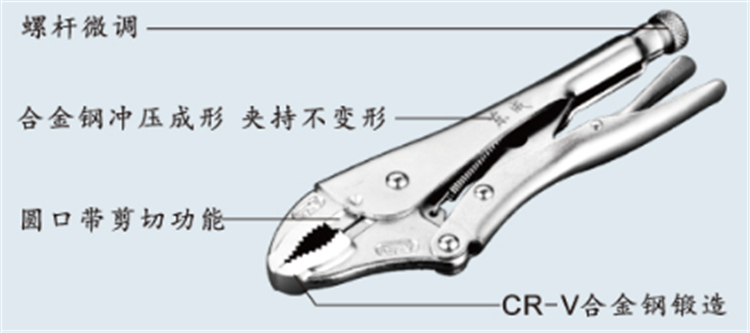 并產(chǎn)生很大的夾緊力,使被夾緊零件不會松脫,而且鉗口有很多檔調(diào)節(jié)位置,供夾緊