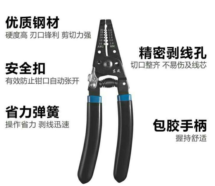 東成彎柄剝線鉗采用優(yōu)質(zhì)鉻釩鋼,整體熱壓,鉗頭抗氧化黑處理,硬度高,不易生