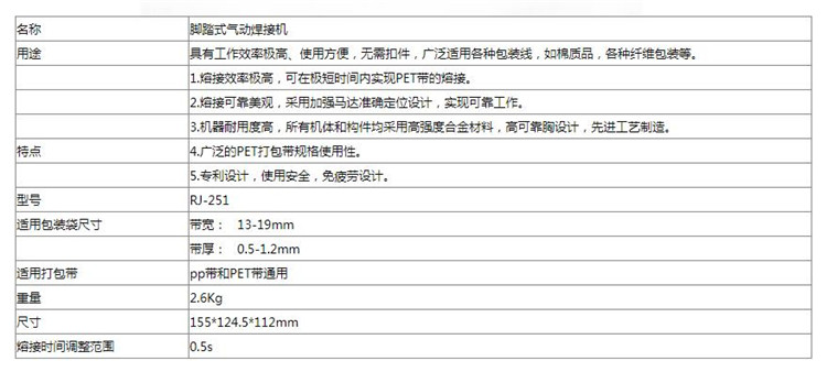 RJ251腳踏式氣動焊接機:機器耐用度高,所有機體和構(gòu)件均采用高強度合金材料,高可靠胸設(shè)計,先進工藝制造。廣泛的PET打包帶規(guī)格使用性。