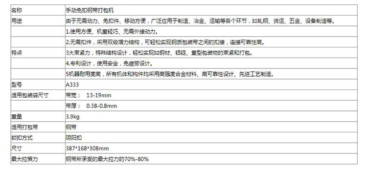 A333手動免扣鋼帶打包機(jī) 參數(shù)展示圖