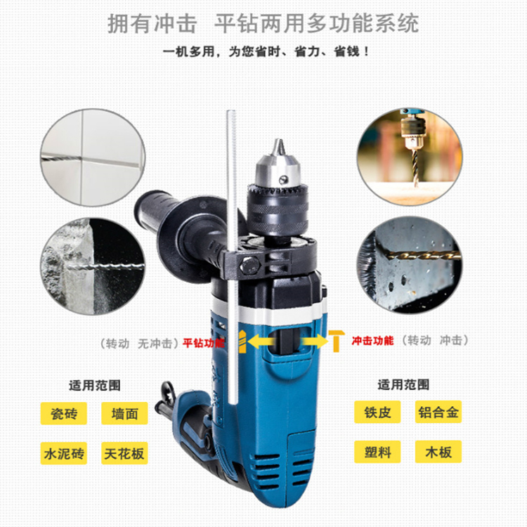 東成沖擊電鉆Z1J-FF-20加裝鉆夾頭組件可搭配各種型號(hào)鉆頭完成各項(xiàng)鉆孔工作