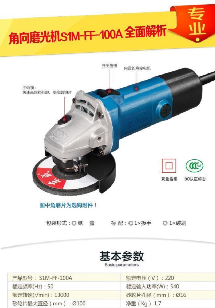 東成角向磨光機(jī)S1M-FF-100A打磨 拋光緊湊型角磨機(jī) 電動(dòng)工業(yè)用具基本參數(shù)