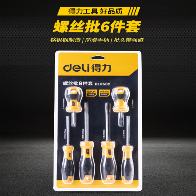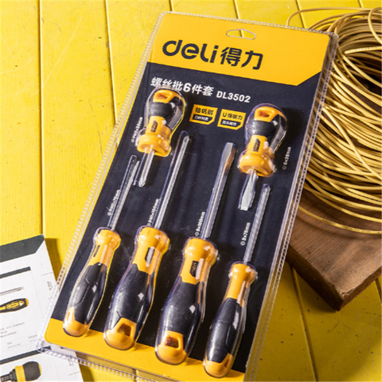得力 螺絲批6件套橡塑雙材質(zhì)手柄,手感舒適,防滑耐油?;Q批頭,批桿亞光處理,不反射強(qiáng)光。