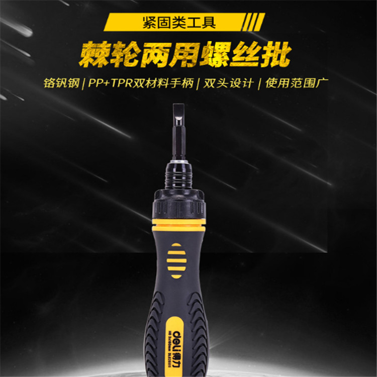 得力棘輪兩用螺絲批批頭材質由鉻釩鋼整體淬火而成,硬度高,韌性好,更耐用。