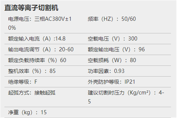 東成直流等離子切割機(jī)基本參數(shù)圖
