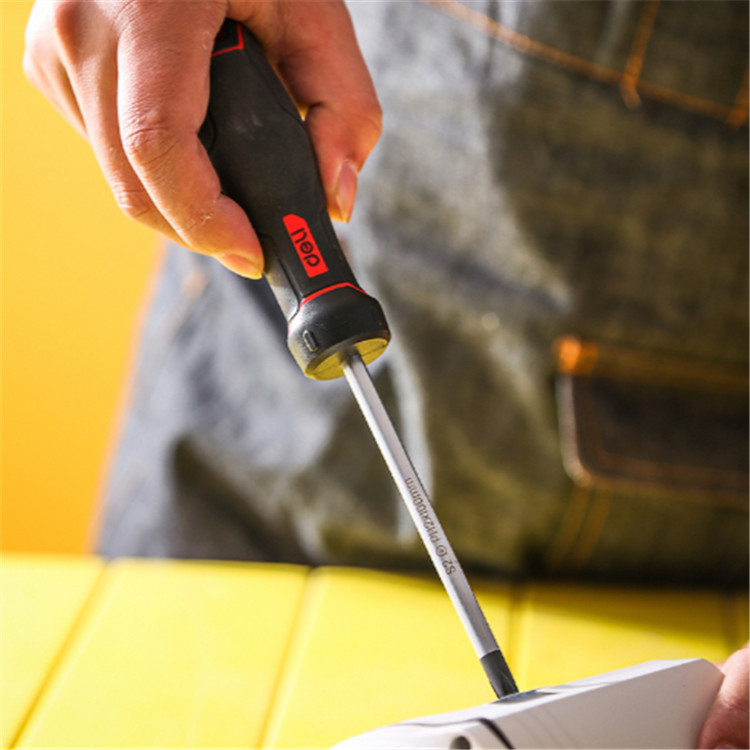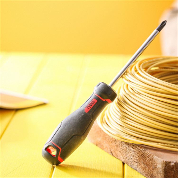 得力S2一字螺絲批橡塑雙材料手柄,表面有精致花紋,握柄前端防轉(zhuǎn)凸點(diǎn)設(shè)計(jì)。