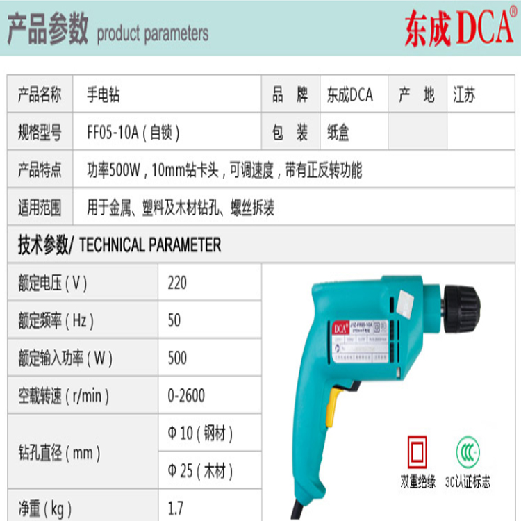 東成DCA手電鉆多功能正反電轉(zhuǎn)槍調(diào)速微型電轉(zhuǎn)東城電鉆 雙重絕緣 FF05-10A