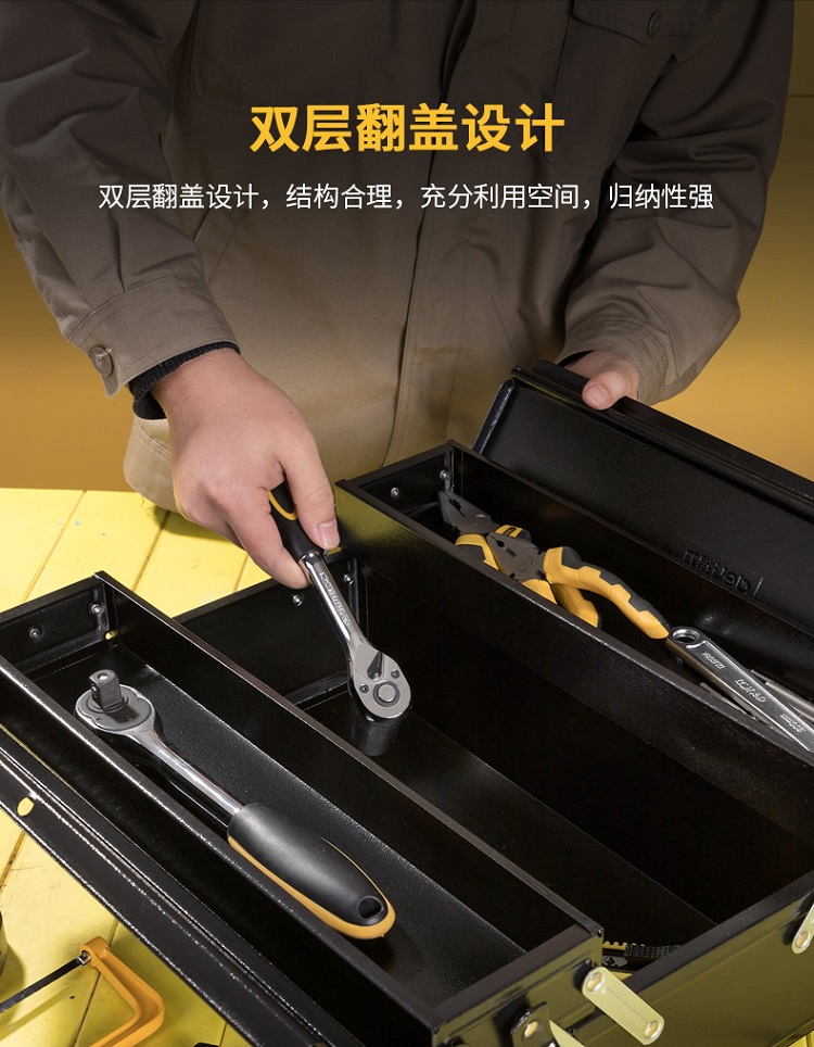 工具箱雙層翻蓋設(shè)計(jì),結(jié)構(gòu)合理,充分利用空間,歸納性強(qiáng)