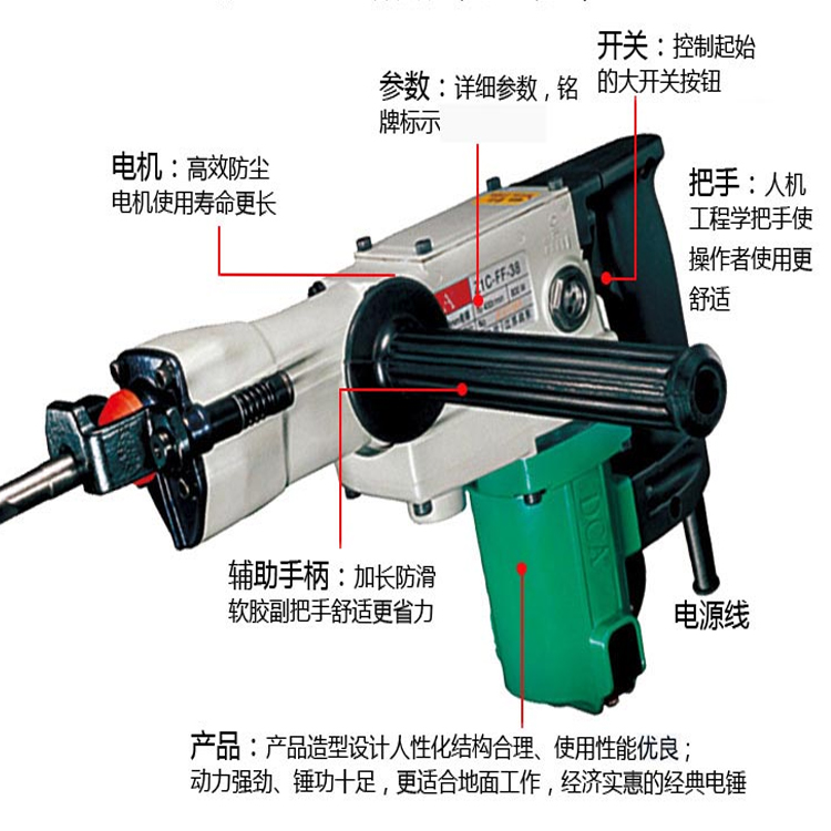 DCA電錘Z1C-FF02-38主要用來在混凝土、樓板、磚墻和石材上鉆孔。