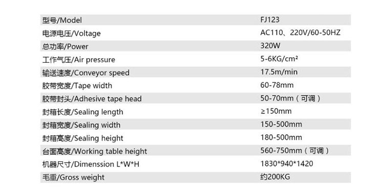 FJ123全自動上左右驅(qū)動封箱機 全自動膠帶封箱機 紙箱封箱機 產(chǎn)品參數(shù)圖