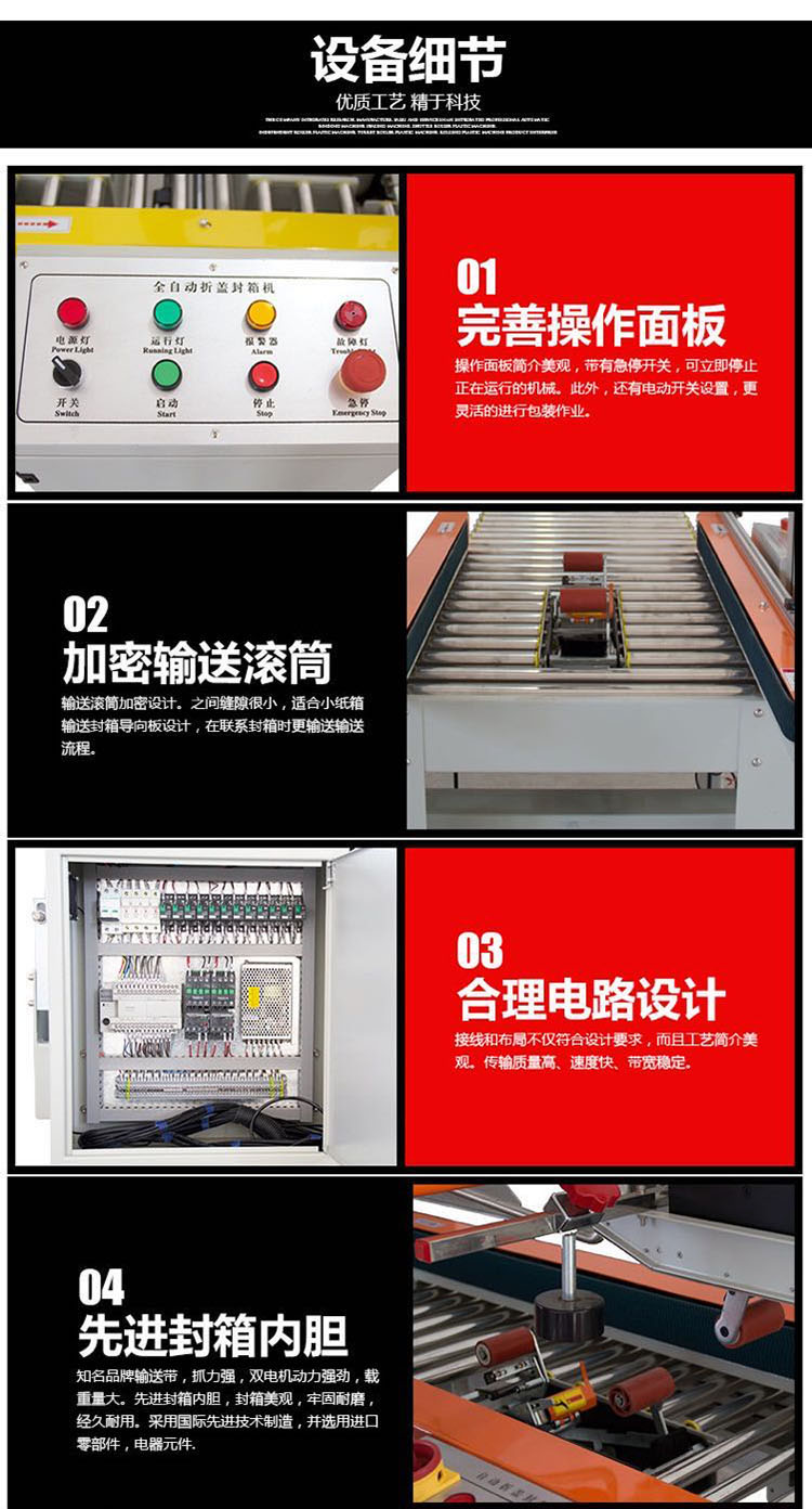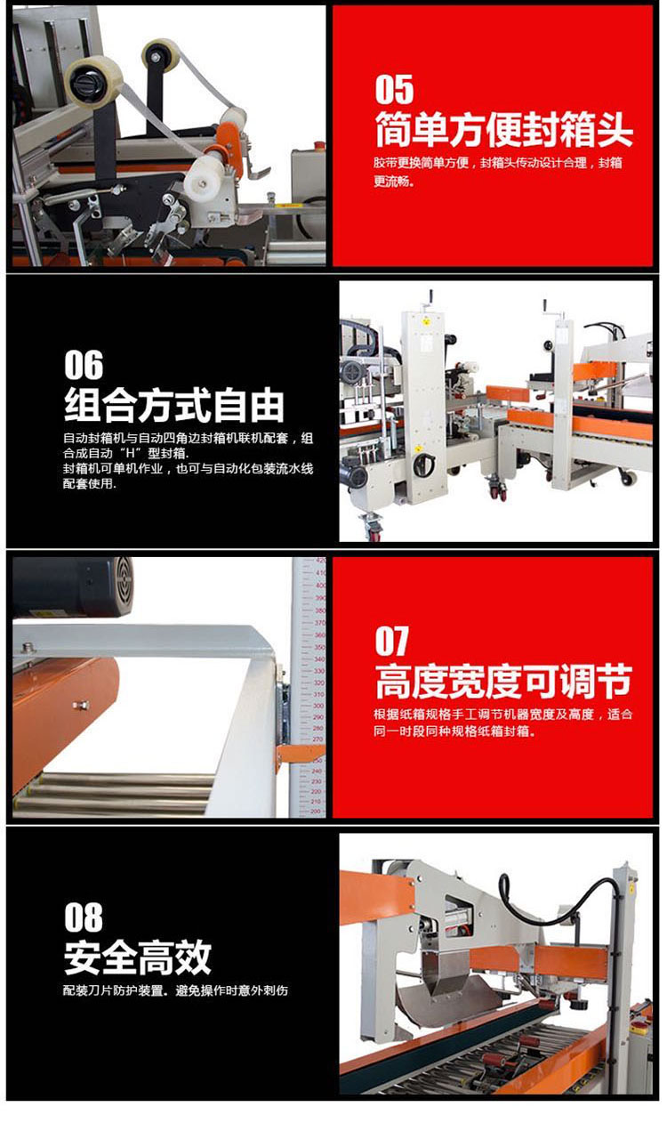 全自動上左右驅(qū)動封箱機可根據(jù)不同紙箱規(guī)格,自動調(diào)節(jié)寬度及高度,操作方便、簡單、快速。