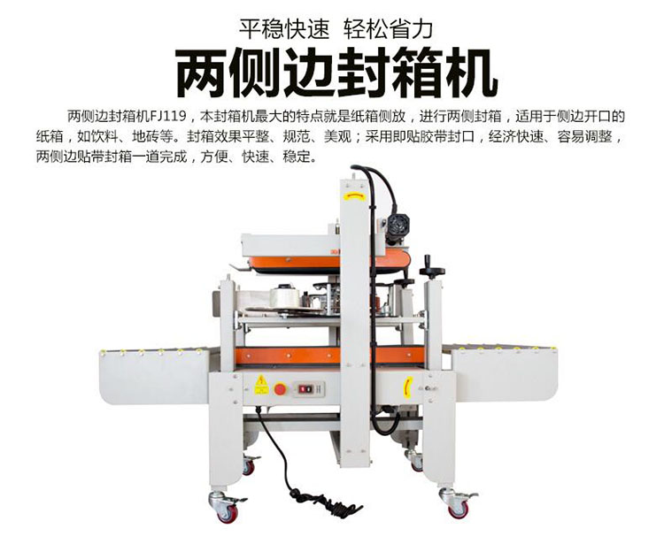 兩側(cè)邊封箱機F119,本封箱機的特點就是紙箱側(cè)放,進行兩側(cè)封箱,適用于側(cè)邊開口的紙箱,如飲料、地磚等。封箱效果平整、規(guī)范、美觀;采用即貼膠帶封口,經(jīng)濟快速、容易調(diào)整,兩側(cè)邊貼帶封箱一道完成,方便、快速、穩(wěn)定。