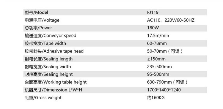 FJ119封箱機 半自動側(cè)封驅(qū)動膠帶封箱機 兩側(cè)膠帶封箱機 產(chǎn)品參數(shù)圖