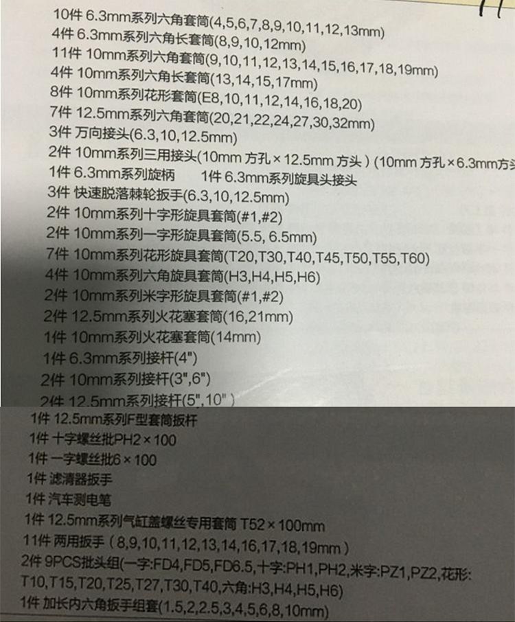 123件汽保維修組套扳產(chǎn)品明細圖。
