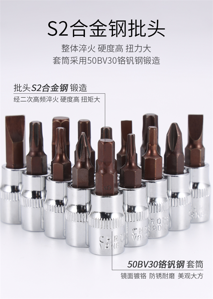 長(zhǎng)鹿套筒組套多功能維修工具采用S2合金批頭、整體淬火、硬度高、扭力大。