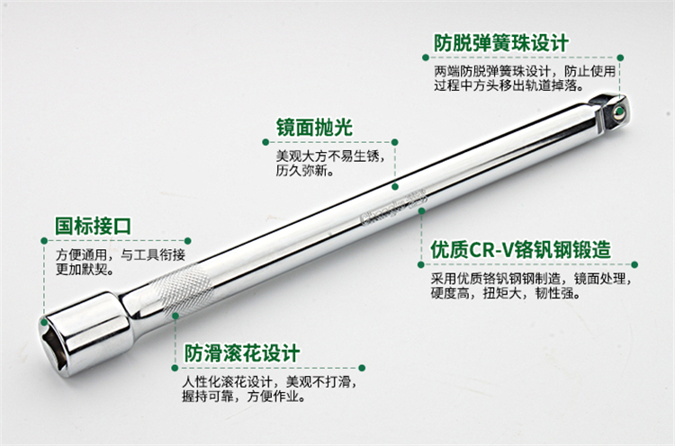 長鹿12.5mm系列鏡面搖桿 1/2接桿兩側防脫彈簧珠設計,防止使用過程中方頭移出