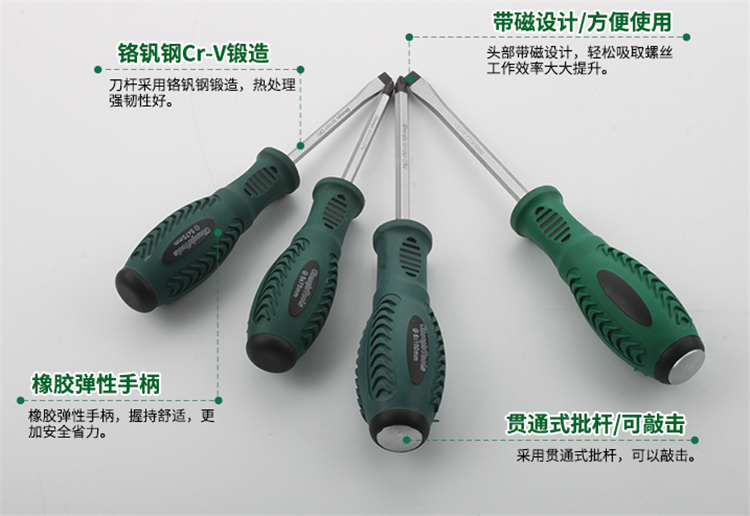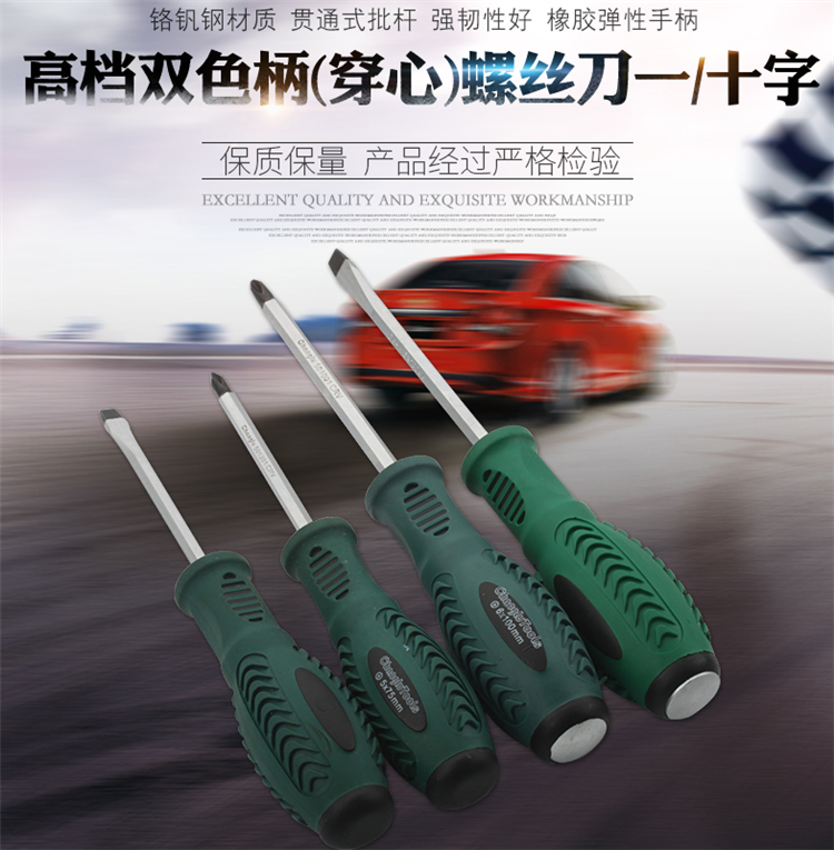 高檔雙色螺絲刀鉻釩鋼材質(zhì)、貫通式批桿、強(qiáng)韌性好、橡膠彈性手柄。
