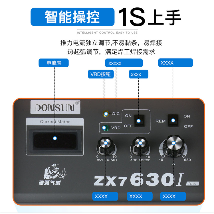 手,接力電流獨(dú)立調(diào)節(jié),不易黏條,熱起弧調(diào)節(jié),滿足焊工焊接需求。- 型號(hào)名稱ZX7-630I(標(biāo)配)