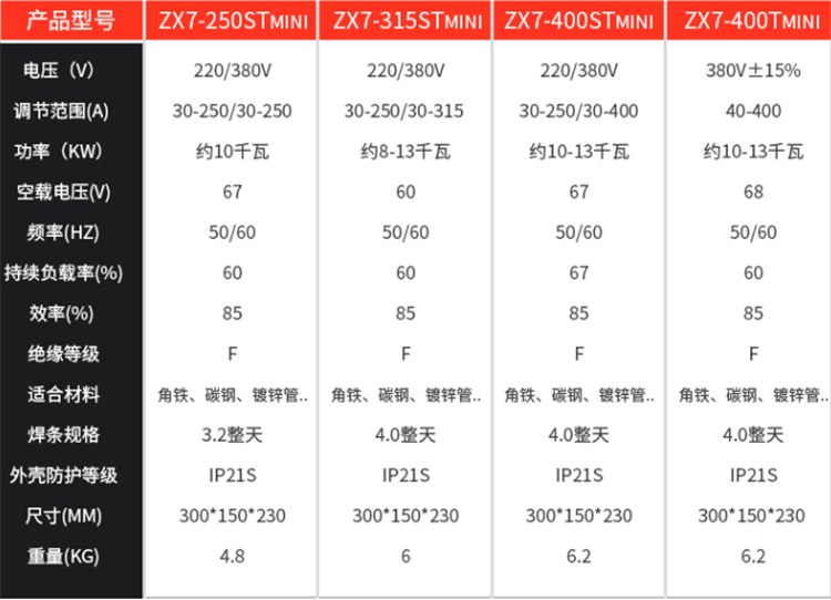 東升電焊機ZX7-250STMINI/315STMINI/400ST智能雙電壓逆變直流技術(shù)參數(shù)