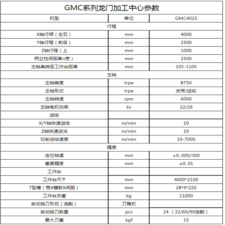 雅力士精機龍門加工中心GMC4025參數(shù)