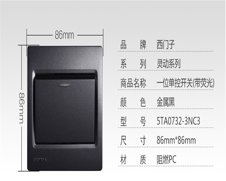 西門子 開關(guān)插座面板靈動(dòng)金屬黑墻壁開關(guān)一開單控帶熒光