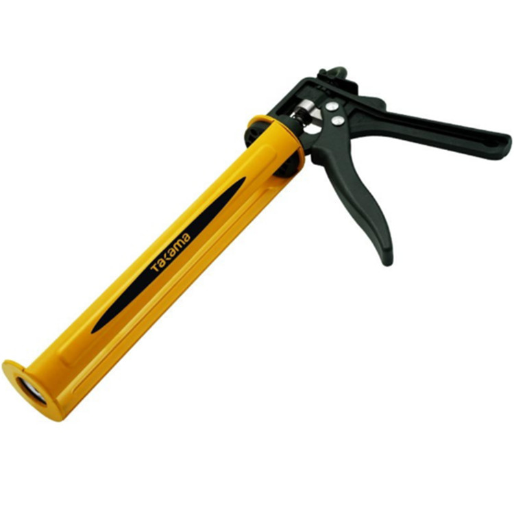 Takama(高松)冷軋鋼旋式堵縫槍先將美縫劑槍尾部的手柄向外扒,直到聽到咔的聲響,將尾部的推桿抽出,然后將美縫劑裝入膠筒中,注意單組美縫劑槍裝入單份美縫劑即可,雙組則裝入雙份,最后將之前取出的推桿推入,抵住美縫劑就可以開始施工了。