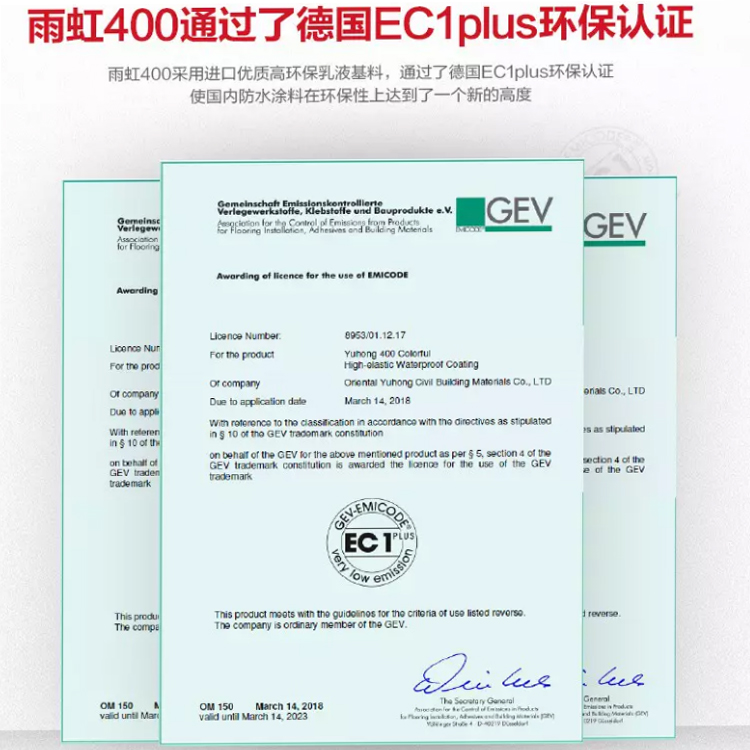 雨虹400采用進口優(yōu)質環(huán)保乳液基料,通過了德國EC1plus環(huán)保認證