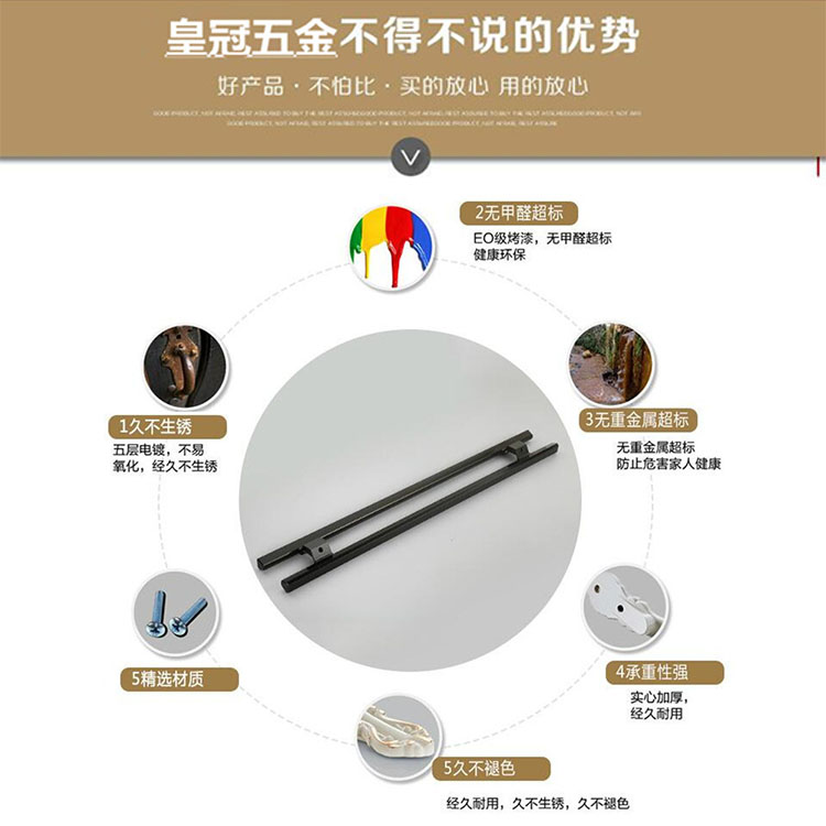 皇冠304不銹鋼推拉門拉手,采用多層處理,確保產(chǎn)品不生銹、不易磨損。