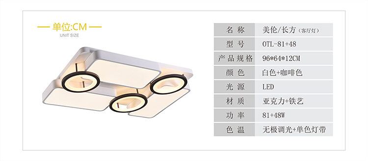 歐特朗OTL-81+48美倫簡約吸頂燈光源為LED,材質(zhì)為亞克力、鐵藝功率81+48w