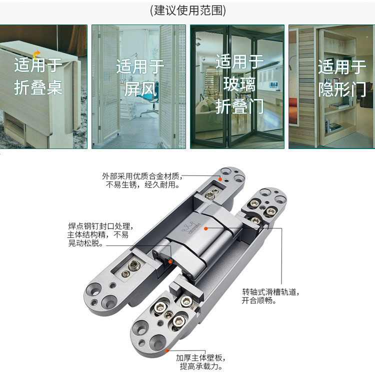 鉸鏈安裝后,開啟角度可達180度,關閉后,暗鉸鏈不外露,美觀大方。
