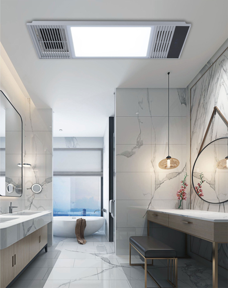 歐特朗OTL-C208宜家超薄四合一系列(雙核)|集成浴霸|風(fēng)暖安裝在衛(wèi)生間實(shí)拍場(chǎng)景,光線柔和,照明效果好