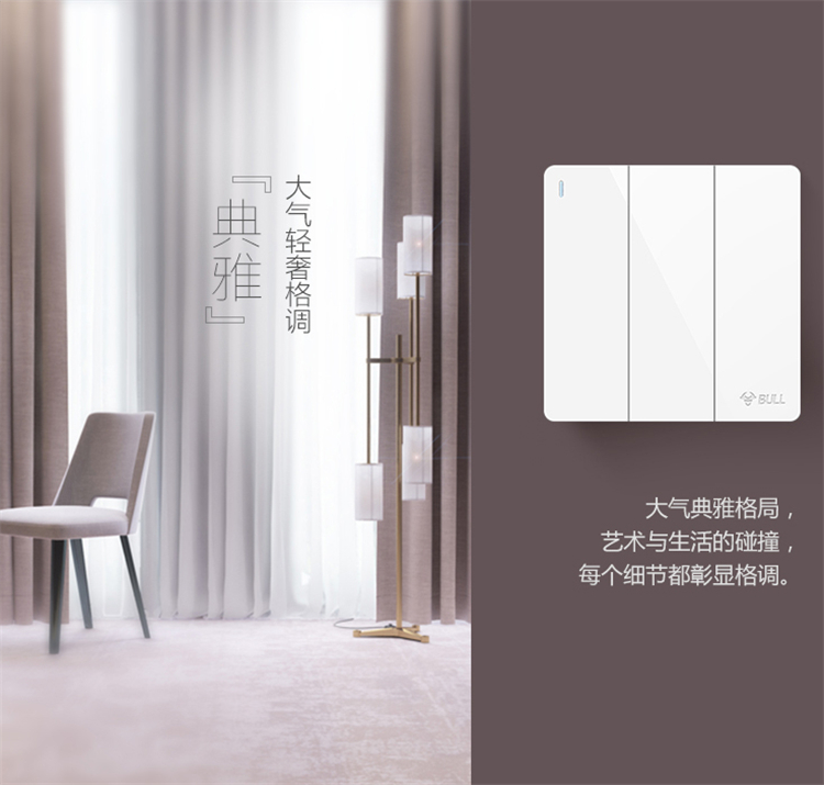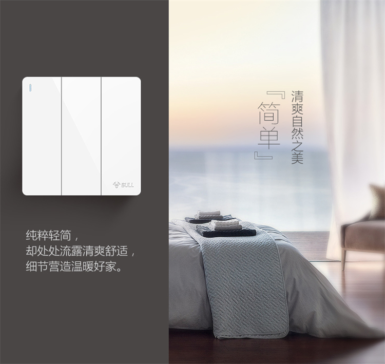 公牛三位雙控帶熒光標(biāo)識開關(guān)G28K312B純粹輕簡,卻處處流露清爽舒適,細(xì)節(jié)營