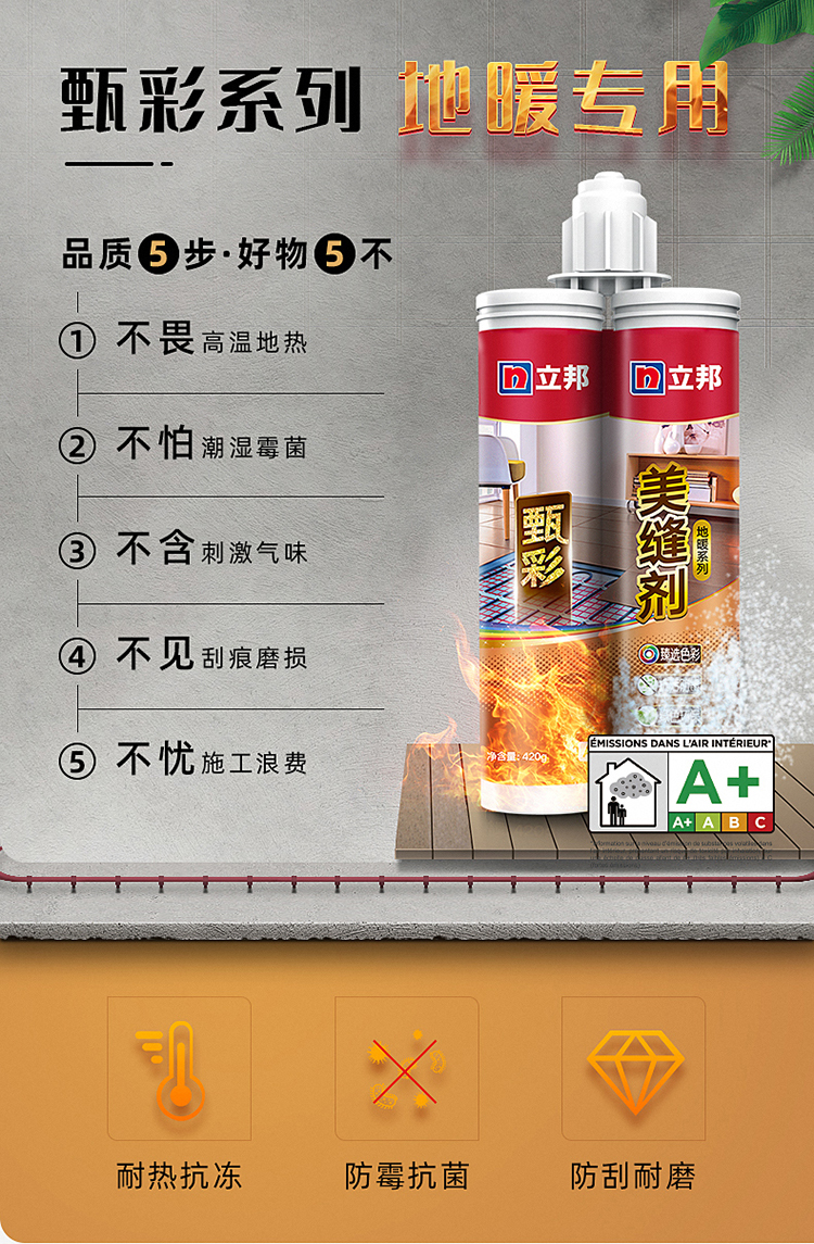 立邦地暖縫美縫劑瓷磚地磚專用美瓷膠美縫膠填縫:堅硬防霉,6-12h完成固化,固化美縫堅如磐石,抑制霉菌生長,再不憂心霉菌滋生。