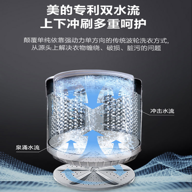 美的全自動波輪洗衣機采用雙水流對沖技術(shù),防纏繞更護衣。