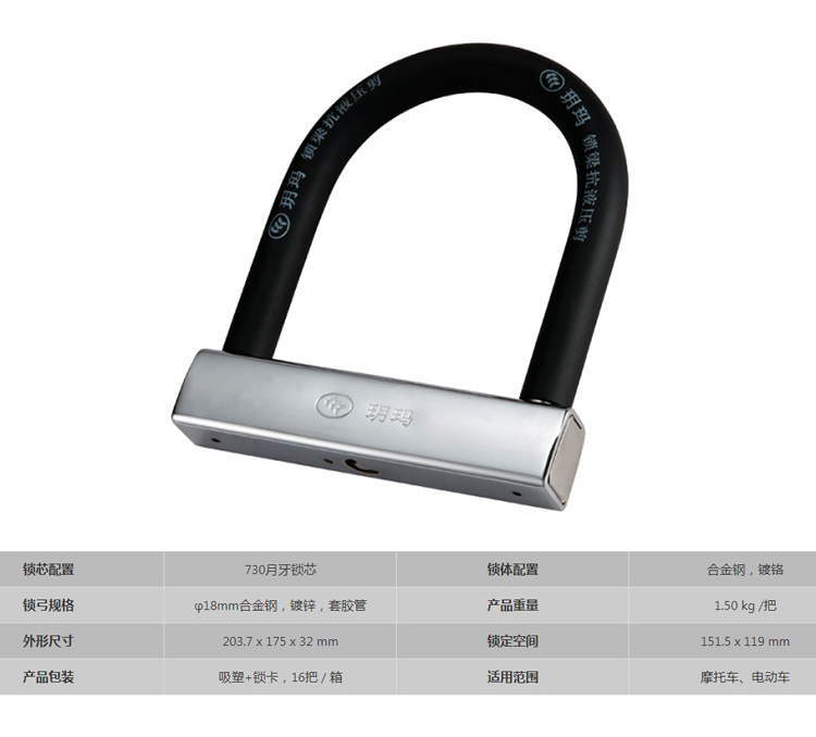 玥瑪電動(dòng)車(chē)U型鎖防盜鎖超B級(jí)別鎖芯,更防盜。