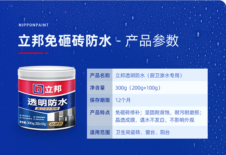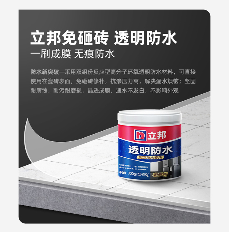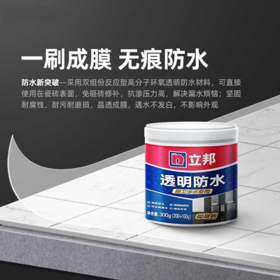 立邦廚房衛(wèi)生間透明防水膠專用防水涂料:高度透明清澈見底,直接使用在瓷磚表面,晶透成膜,免砸磚修補。