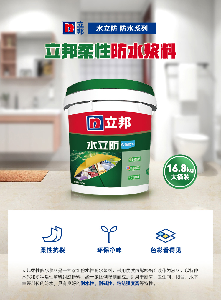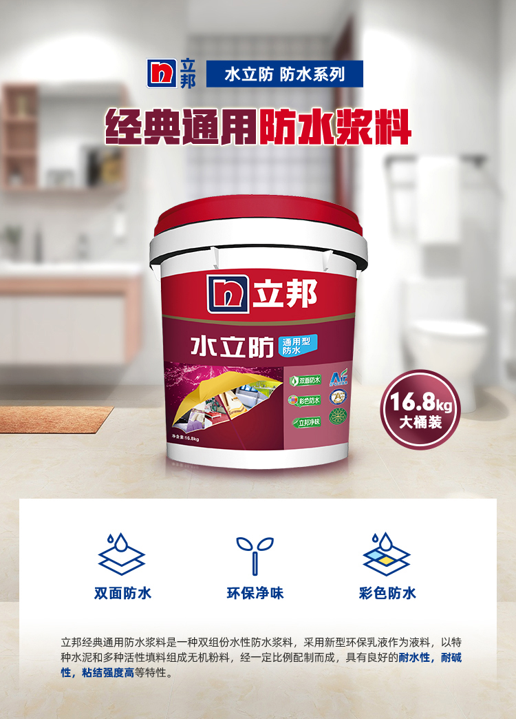 立邦經(jīng)典通用防水漿料是一種雙組份水性防水漿料,采用新型環(huán)保乳液作為液料,以特種水泥和多種活性填料組成無機粉料,經(jīng)一定比例配制而成,具有良好的耐水性,耐堿性,粘結(jié)強度高等特性。