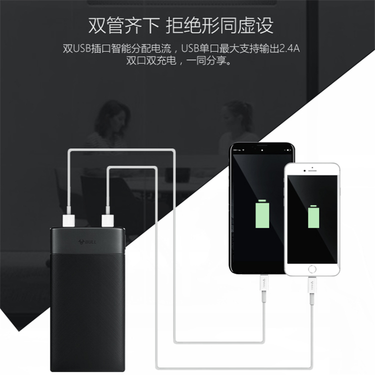 公牛通用快充移動電源(青春版)插口智能分配電流,USB單口支持輸出2.4A,雙口