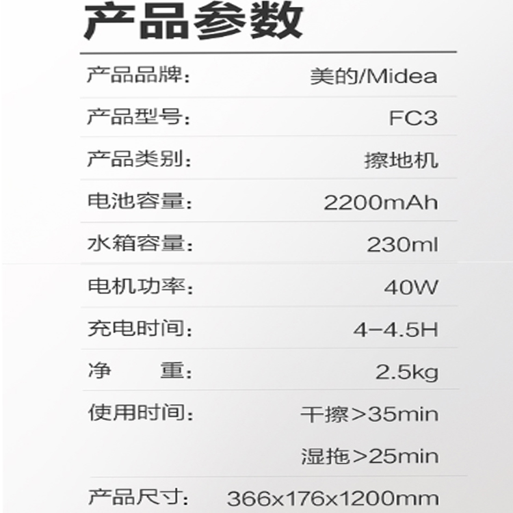 美的(Midea)無線手持電動拖把FC3 家用靜音大功率擦地機清潔機 干拖濕拖打蠟